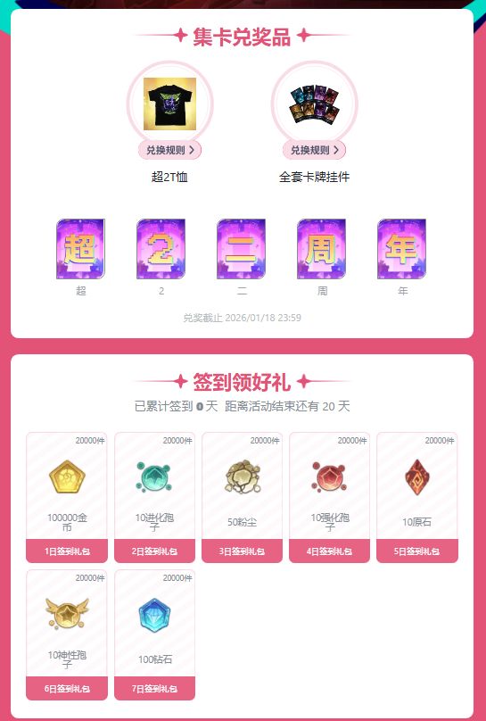 参与《超2》签到集卡活动,累计签到可领取游戏道具奖励!签到时,探索者还可以随机获得一张字卡,集齐对应字卡就能兑换【超2T恤】、【全套卡牌挂件(共8款)】实物周边!