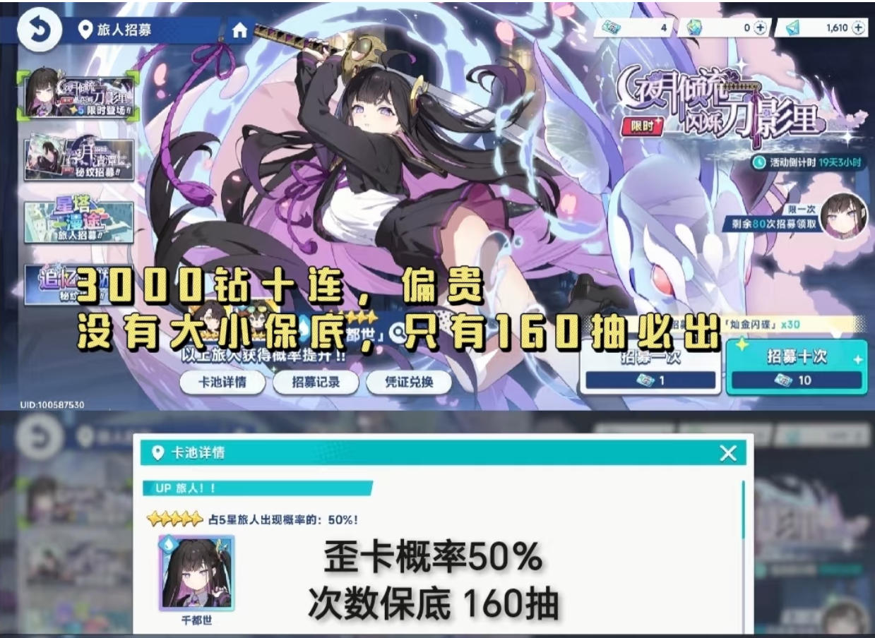 游戏的定价是300钻石一抽,充648块钱只能换56抽,120抽才能换当期的UP角色,这个次数还不能带到下个池子。
