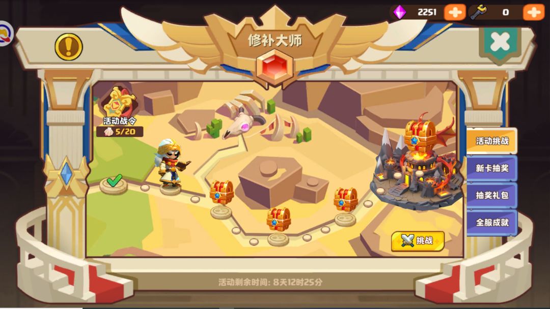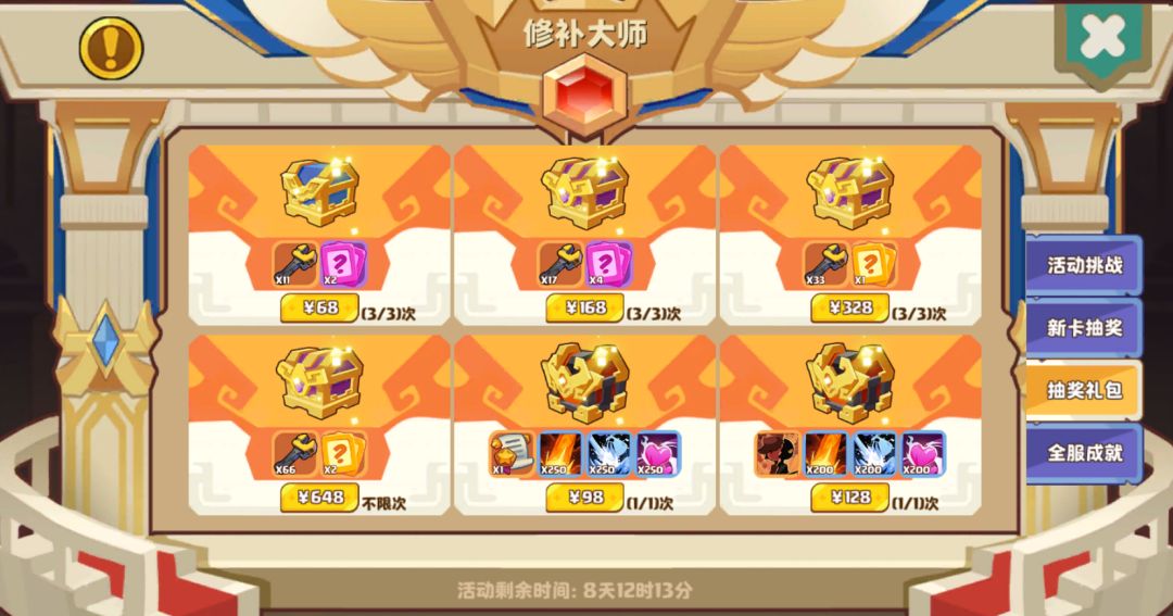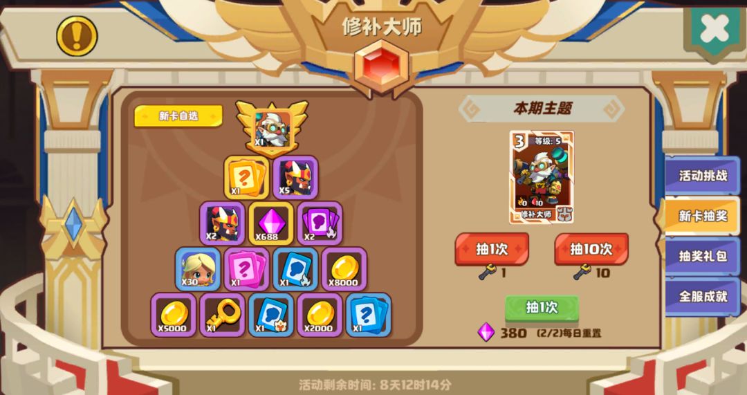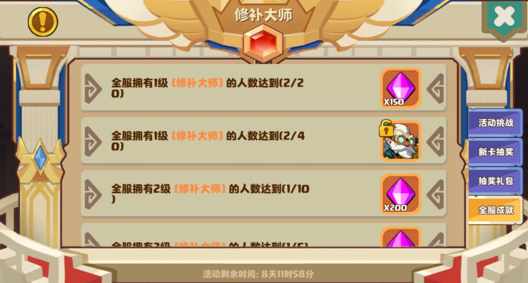 这是一个全服玩家一起共同完成的活动,当拥有修补大师的玩家达到一定数量时,全服玩家都可获得对应奖励,其中也包含全新金卡--基多拉!!!大家一起努力完成吧~