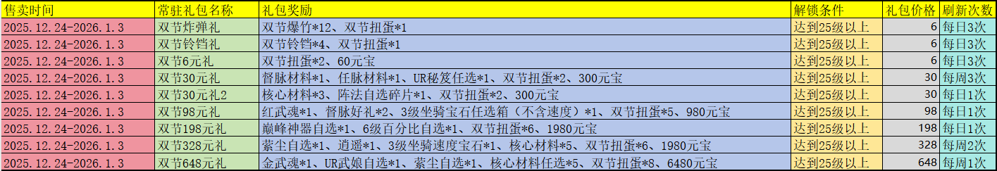 抵近年关,武娘内,也即将迎来圣诞节与元旦节的活动,本次活动时间为2025年12月24日——2026年1月3日;其中,将新增活动道具;双节扭蛋、双节宝铃、双节爆竹等活动道具。以下是具体介绍: