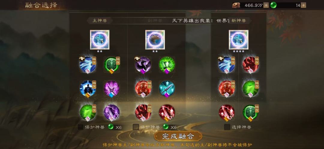 (1)了解不同品质&技能神兽适配阵营,武将,升星、融合、技能升品等基础知识,选定适合自己炼度目标神兽优先级;