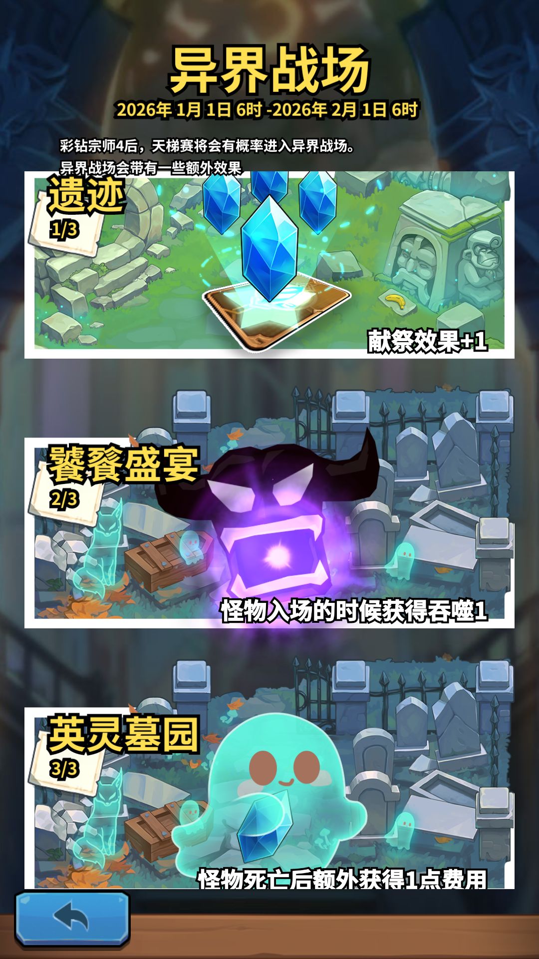1月赛季的战场效果为:英灵墓园,遗迹,饕餮盛宴。