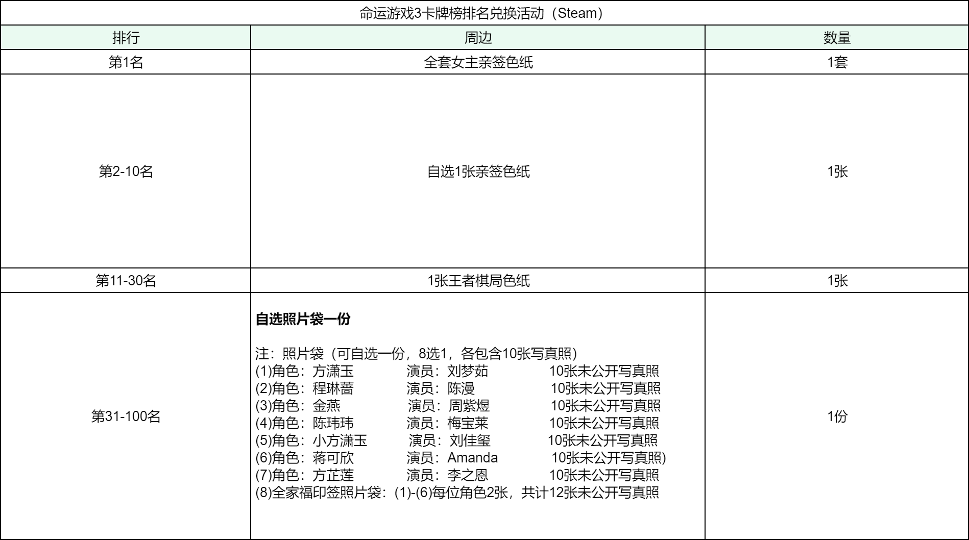 (2) 活动结束时,【排行榜】-【卡牌榜】排行前100名可以兑换对应周边。