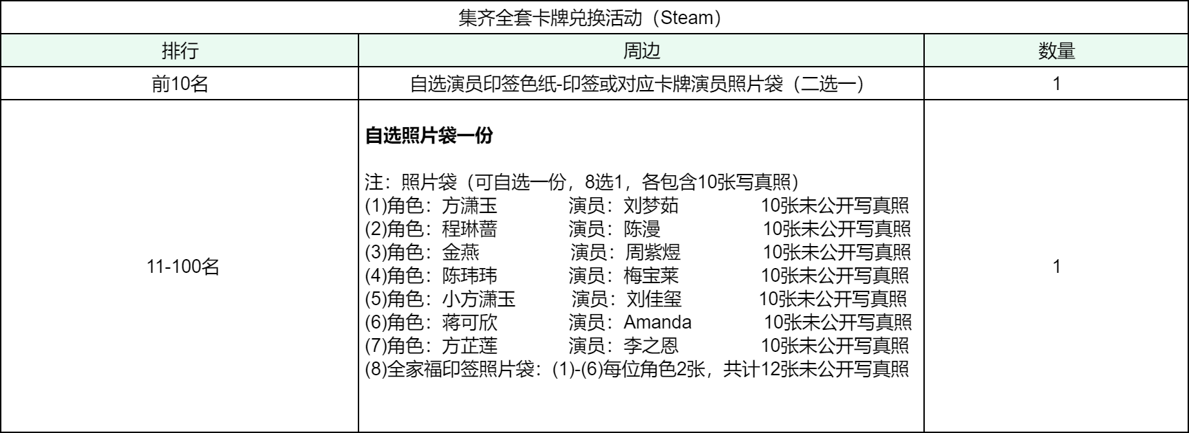 (2) 兑换条件:集齐以下任意一项全套卡牌即可兑换周边,限量前100;以收集到目标全套卡牌并填写报名的时间排名,先到先得。