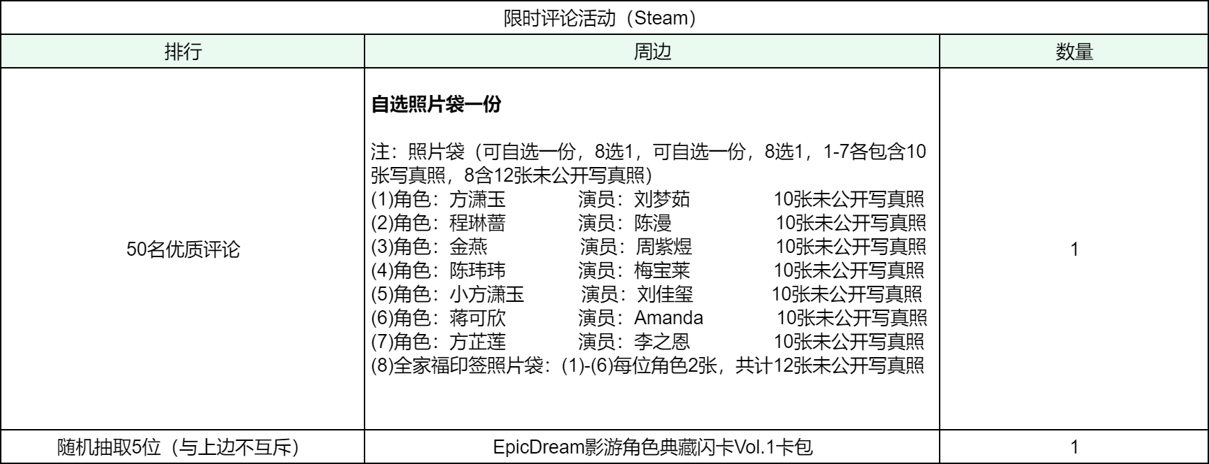 1. 从报名表单中选出50位优质评论玩家,各获得一份自选照片袋