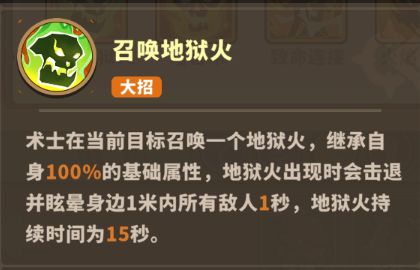 召唤继承100%属性的地狱火,登场击退并眩晕1米内敌人1秒,持续15秒。这是阵容的战略控场与爆发点。地狱火不仅是强力前排,其出场控场能在关键时刻控制敌人,打乱阵型