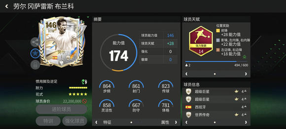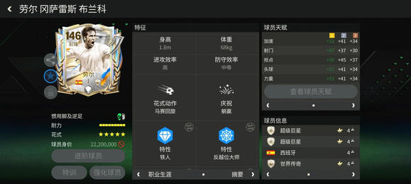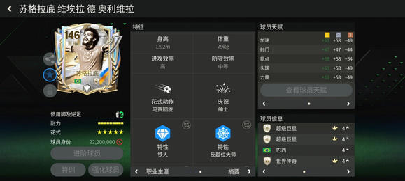 26周年庆传奇苏格拉底能力值146,司职前锋,配备了强力锋霸天赋,对他的加速、射门、抢点、头球和力量五项数据均有提升。