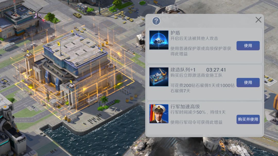 (点击指挥中心-增益)选择即可。如:护盾(开启时间内受到保护,不遭受进攻)、建造队列+1(激活商业建造队,提供额外一队进行建造升级)等功能。
