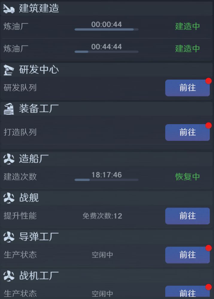 原油、电力、钢铁是《无畏舰队》的“硬通货”——舰船改造、科研、打造装备样样离不了它们!想钱包永远鼓鼓,先把炼油厂、发电厂、钢铁厂重建并升级到当前最高等级!