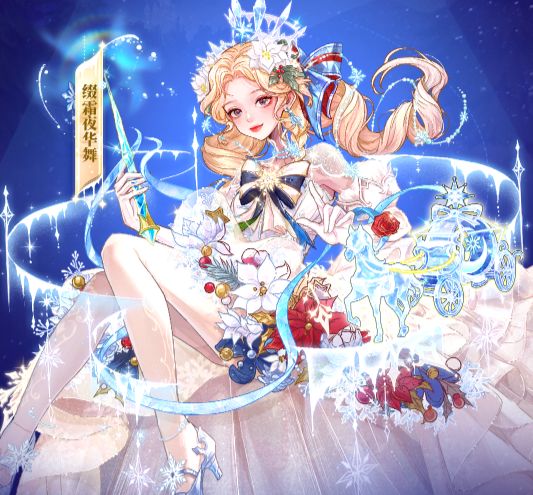 本次六星时装是独特的梦幻童话风格,女性时装名为“缀霜夜华舞”,她身穿华丽的白色礼服,头顶白色水晶的王冠,裙摆点缀着花朵,而在她的周身环绕着一辆水晶质感的南瓜马车,脚上还有一双精致的水晶鞋。