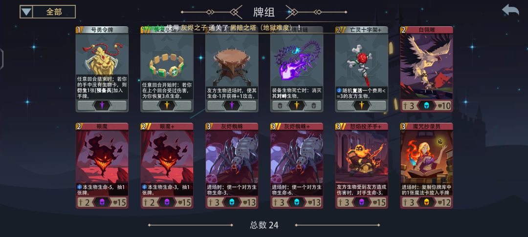 打法思路:灰烬之子初始卡组还不错 清场能力比较强 被动衍生的聚焦冲击也能补点直伤 但总体还是比较依赖生物&装备打伤害 而且适配的自残流卡牌费用都比较高 遇上地狱黑塔的加费debuff会导致前期节奏比较慢 但总体而言还是比较稳的角色 慢慢铺场 用炎魔 烈焰马 连锁闪电清场 配合投矛手和火精灵和英雄装备打伤害能耗死对面