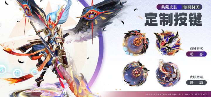 往日神使携来灾厄之焰。 2025年12月26日维护后-2026年4月29日,鸦天狗全新典藏皮肤「蚀羽狩天」将开启限时兑换,售价688达摩币。大人们在鸦天狗典藏皮肤首次上架期间兑换皮肤,即可获赠对应的定制按键——[定制按键·蚀羽狩天],同时,专属动态按键[动态按键·蚀羽狩天]也将同步上架商城,包含拖拽摇杆、普攻点击、装备购买、技能升级的操作动效,售价298勾玉,喜欢的大人们可别错过啦~