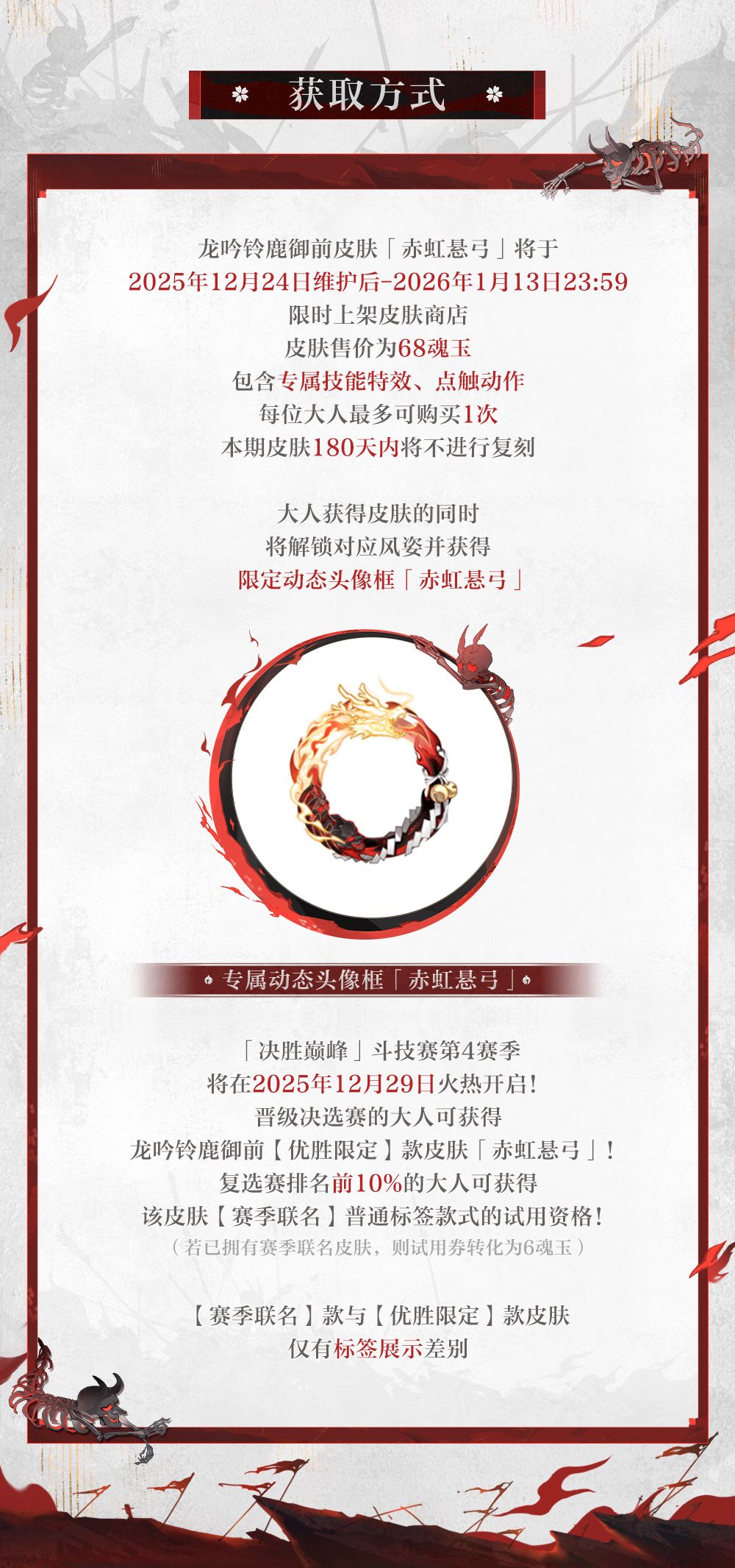 △「决胜巅峰」斗技赛第4赛季将在2025年12月29日火热开启!龙吟铃鹿御前赛季联名皮肤「赤虹悬弓」将于2025年12月24日维护后-2026年1月13日23:59限时上架皮肤商店,售价68魂玉,包含专属技能特效、点触动作,每位大人最多可购买1次,本期皮肤180天内将不进行复刻。大人获得皮肤的同时,将解锁对应风姿并获得限定动态头像框「赤虹悬弓」。