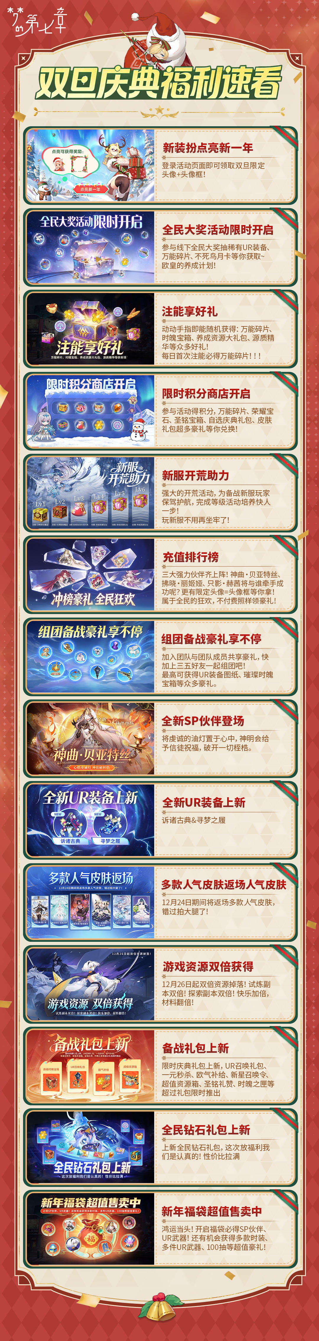 共赴梦的第七章,同载双旦欢。值此佳节来临之际,我们也准备了双旦特别专场活动,诚邀各位队长的到来!注能抽大奖、限时积分商店、人气皮肤返场、新服开荒助力、庆典备战礼包、累充累消馈赠……等等一系列精彩活动即将开启!SP伙伴、UR装备、万能碎片、限定头像等超多豪礼等你来拿!活动详情将在后续揭晓,敬请期待!