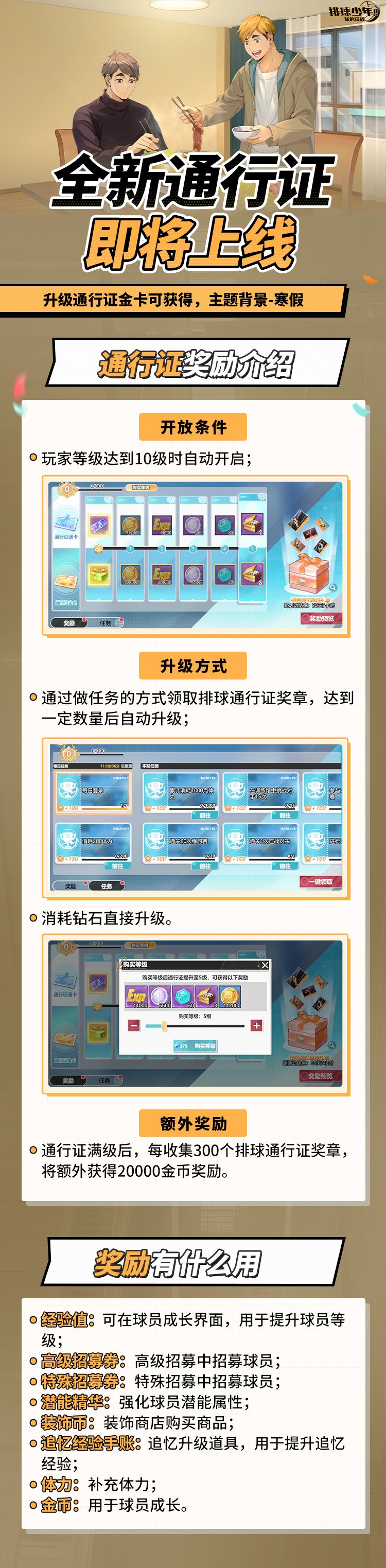 活动期间,通过做任务的方式领取排球通行证奖章,达到一定数量后自动升级。升级可陆续解锁经验值、高级招募券、特殊招募券、装饰币、潜能精华等奖励;【进阶金卡】可获得本期通行证主题背景「寒假 NO.1」。