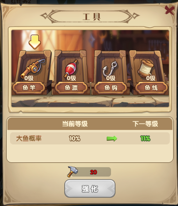 •渔具升级:消耗“锻造锤”提升渔具等级,获得多样化钓鱼加成。