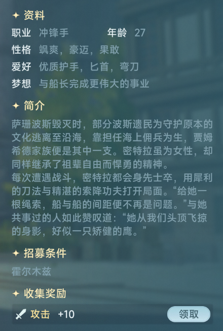 可以看到,他的收集奖励直接+10攻击,完美适配肉搏战!