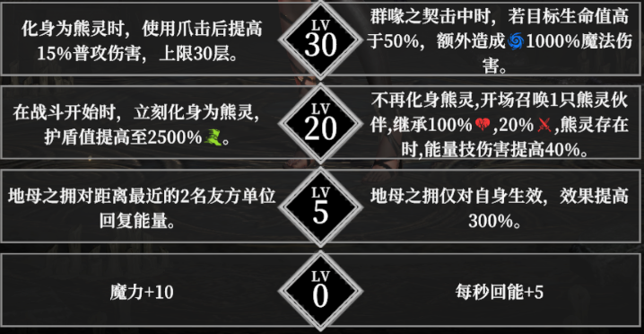 生命值低于50%时,变身为熊灵,获得高额护盾,100%魔法穿透的穿甲值。熊灵为近战单位,普攻对范围内的敌人造成物理伤害。能量技降低范围内所有敌人10%的伤害增强和伤害减免,持续10秒。