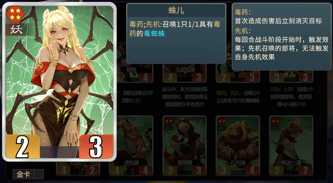 大多数情况下,蛛儿作为相柳的补充,在相柳明确会在对方先机之后阵亡时,蛛儿刚好有空位召唤毒蜘蛛。