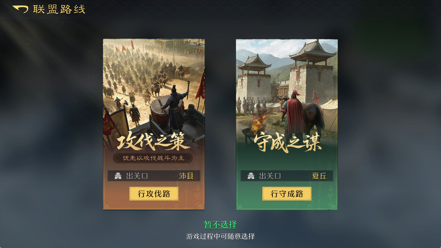 在联盟创建后,系统会推荐两种打关口出州的路线方案,分别是【攻伐之策】和【守成之谋】。