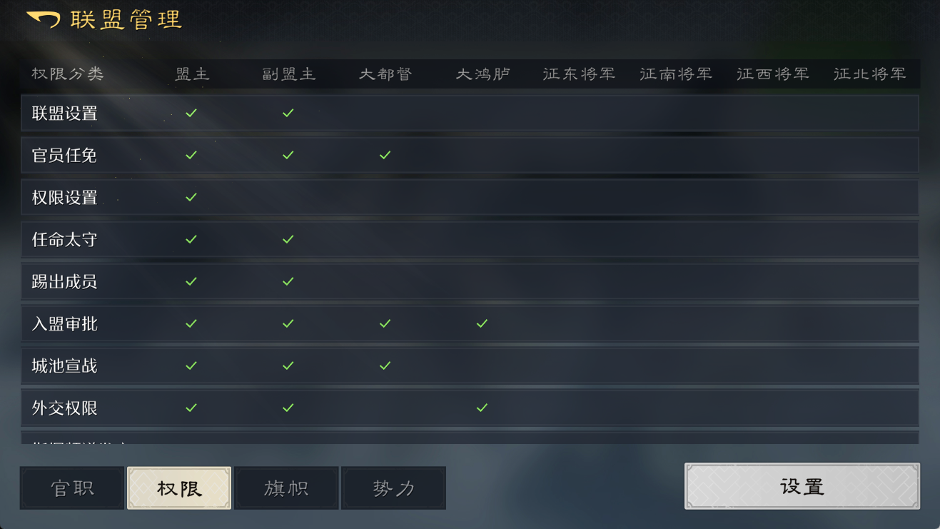 其中,盟主可以给其他官职自由分配权限,用来分配管理任务,这样做也可以避免误操作导致的意外事件。