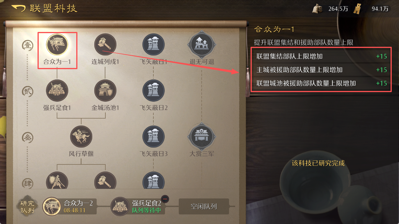 尽早发展集结科技:集结的队伍数量可以通过同盟科技【合众为一】提升;集结的兵力上限可以通过同盟科技【强兵足食】提升。
