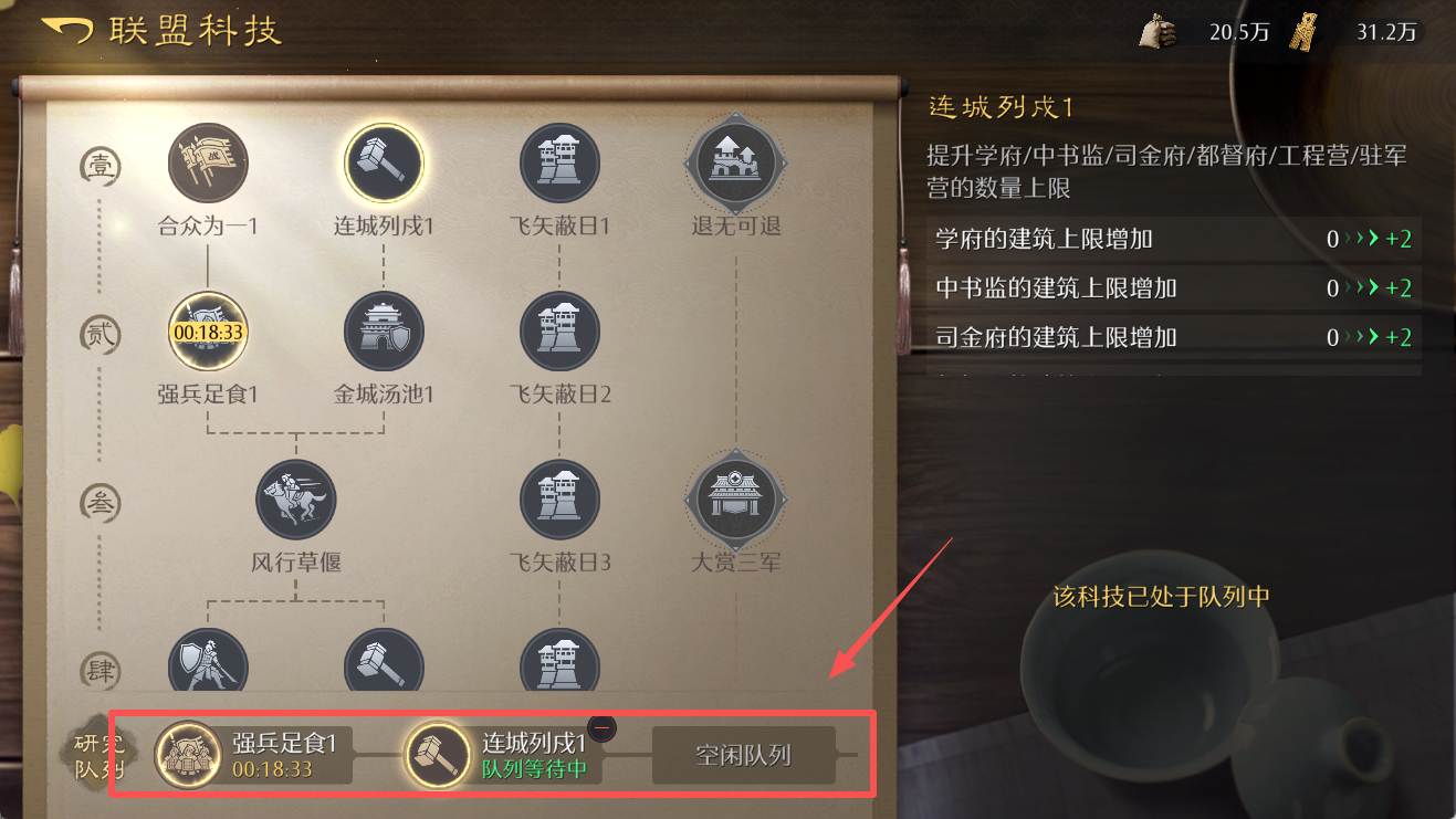 科技需要花费辎重和资金进行研究,部分奇策也是科技研究后才解锁。 在公测版本中,科技的研究增加了队列功能,可以一次安排多个科技,这样可以不用定时定闹钟半夜起来研究了。