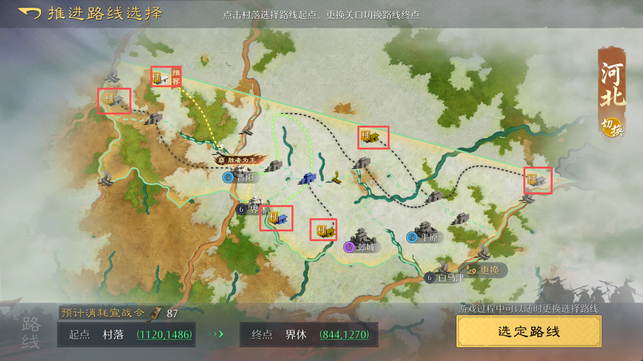 在《九牧之野》,联盟从出生州到出关,是需要从1级村庄开始,一个一个城池攻打到关口的,因此推进路线的选择至关重要。