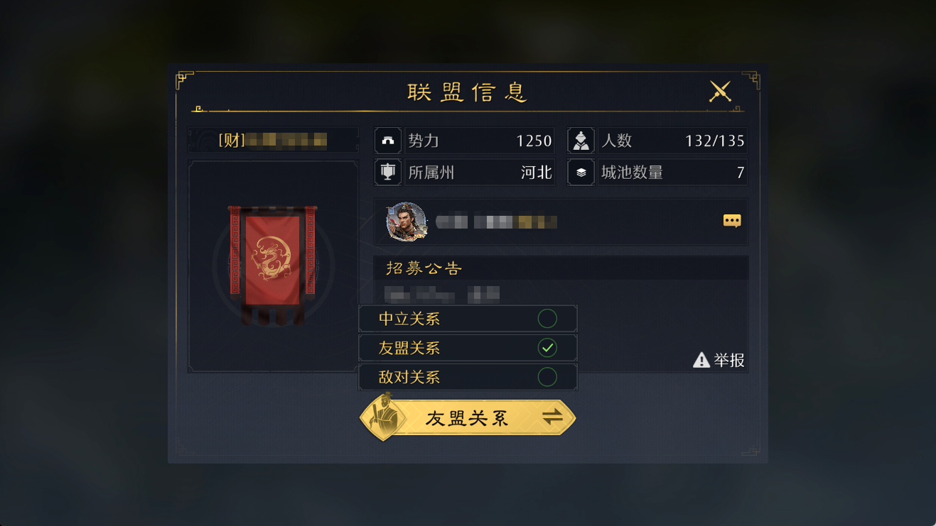 游戏里,联盟中也有外交的功能。拥有外交管理权限的官员,可以和其余联盟设立外交关系,共分为三种,分别是中立、敌对和友盟。