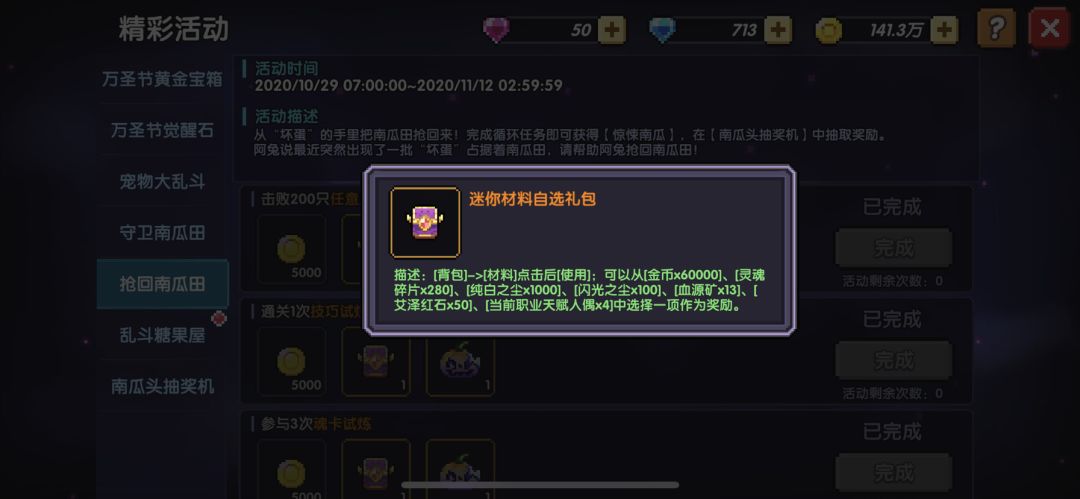 5.活动:现在活动奖励也是有一定的重复性的,比如这次的万圣节送的是材料自选礼包,还有的是直接用活动获得的货币直接换一定数量的血原矿,没有满5星武器的小伙伴一定不能错过如此数量庞大的奖励,每次活动基本都能获得200不等的血原矿