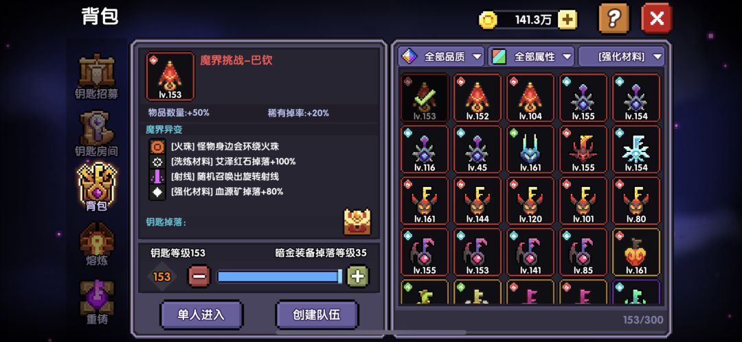 4.魔界钥匙:自己背包里的钥匙除了红色钥匙需要武器碎片以外,初期建议重铸强化材料词缀来获得血原矿。还有每日钥匙白漂13次,可以选择拥有强化材料词缀的房间进。