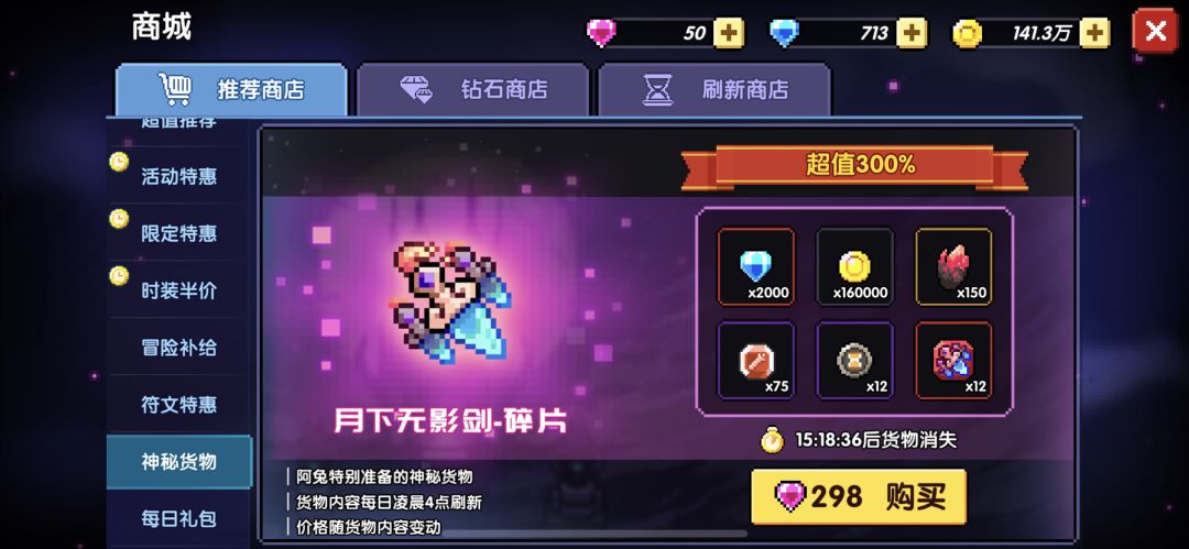 3.神秘货物:每日都会刷新,虽然我没买过,因为存粹为了血原矿的话及其不划算,唯一比较诱惑的就是钻石。武器碎片 刷新币之类的看需求吧。土豪随意