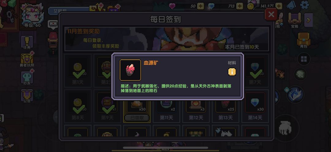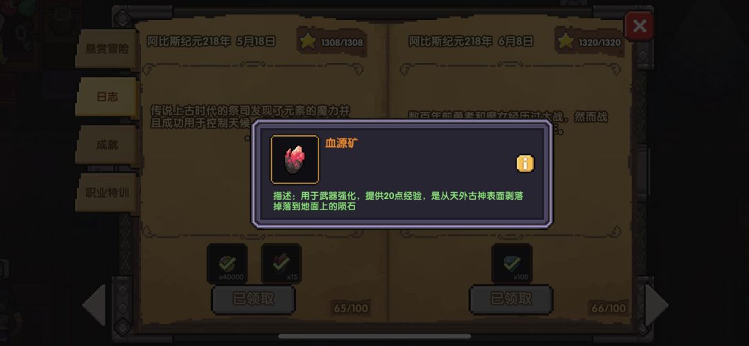 3.秘境:每日上限120次秘境,每次概率掉落3个不等的血原矿(有概率不掉),看个人吧,时间多的可以肝一下获得血原矿的同时还能获得大量经验,肝党必备。另外通关秘境之后在界面还能领取一个人宝箱其中也有血原矿。通关秘境之后获得的星也可以在日志中获得各种材料也有血原矿。