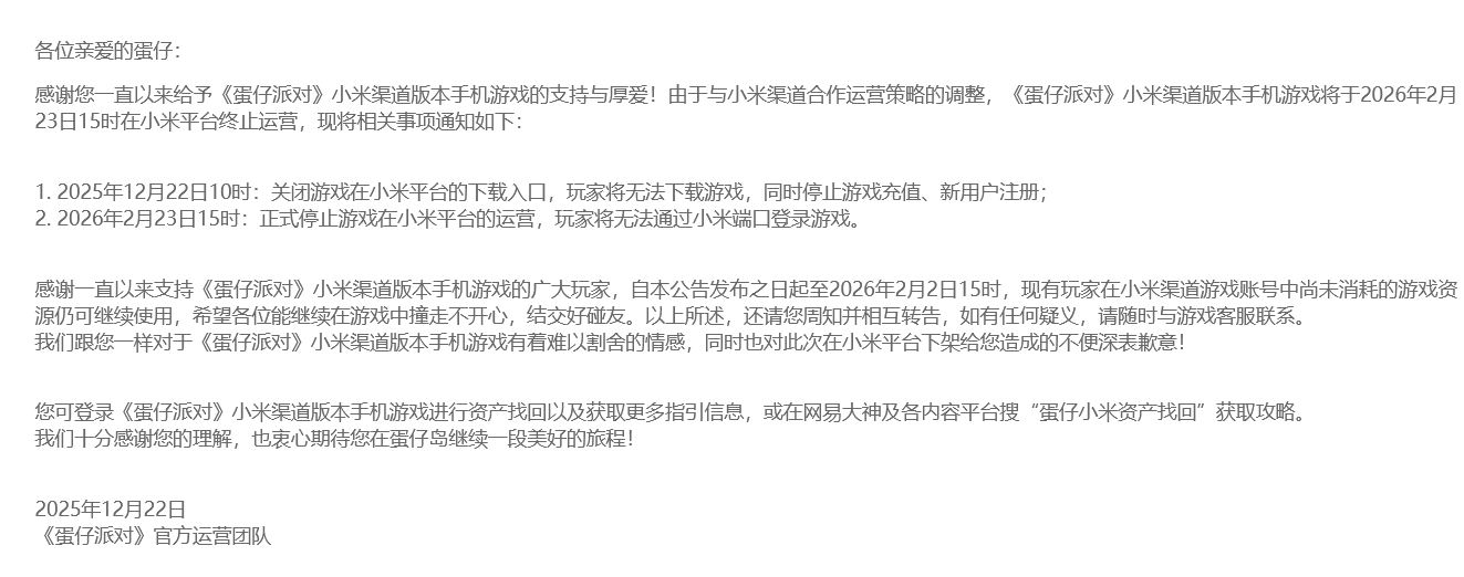 手游《蛋仔派对》发布公告,宣布其“小米渠道服”即将终止运营