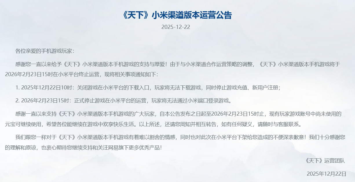 除《蛋仔派对》小米渠道服关闭外,网易旗下另一款游戏《天下》也在相同时间终止运营