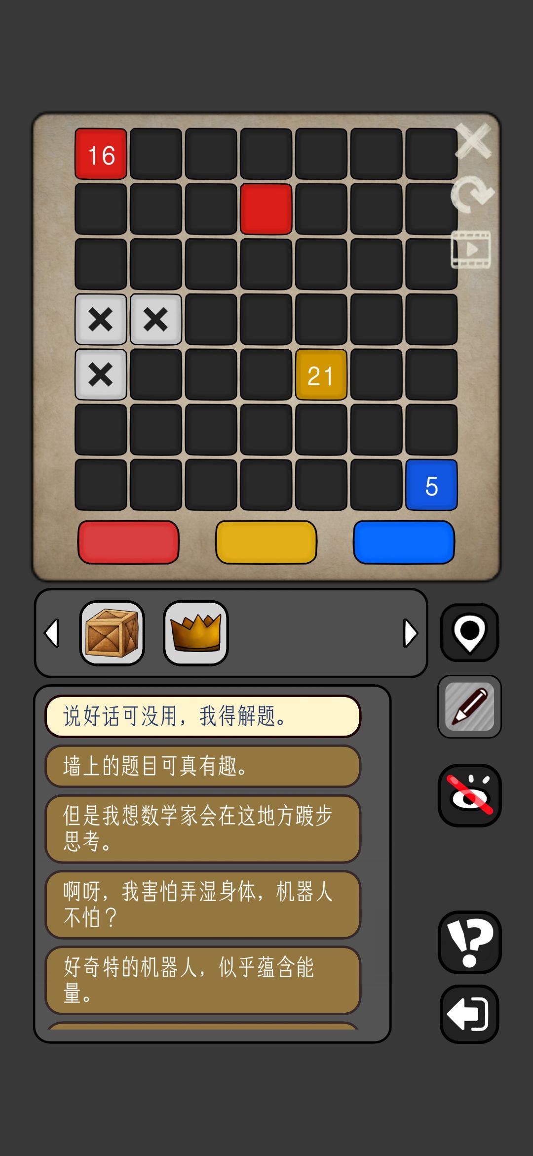11.泳池右手边房间数独谜题如图,另一种解法也对,但是需要等待胖豆丁后期补上,进门,将齿轮插入绿色机器人,投入两本书,6/18/12谜题:依次按按钮(蓝黄黄红红红蓝蓝黄黄黄)给一顶皇冠,16/21/5谜题:依次按(蓝蓝红红红 黄*6)获得加法符号