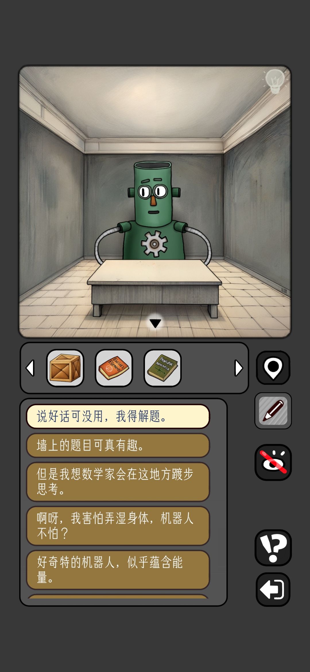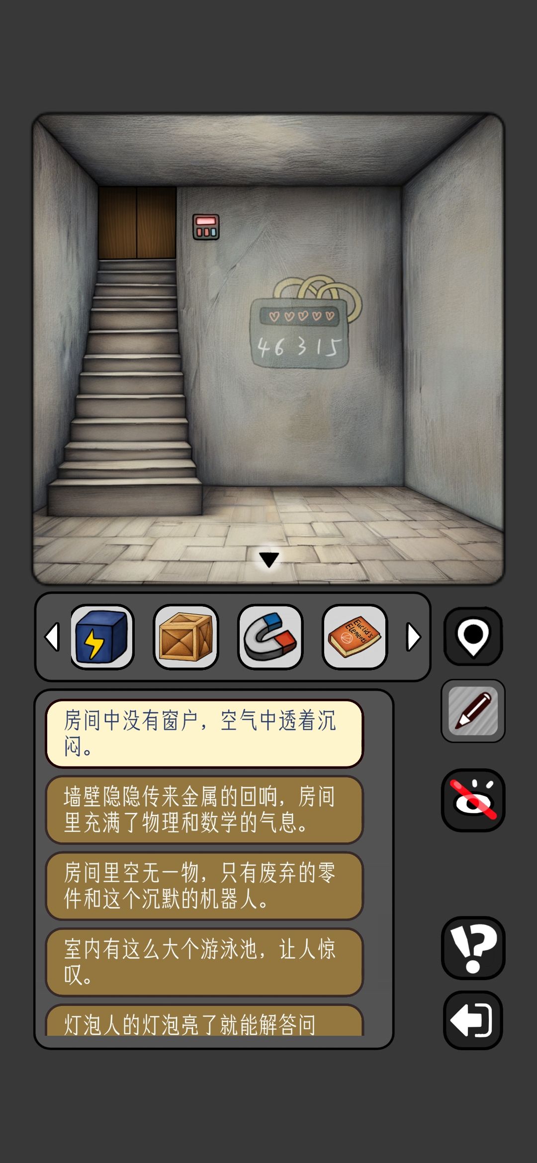 6.接着右走,进入灯泡房间,墙上壁画是泳池的答案,灯泡人需要电池发光获得线索