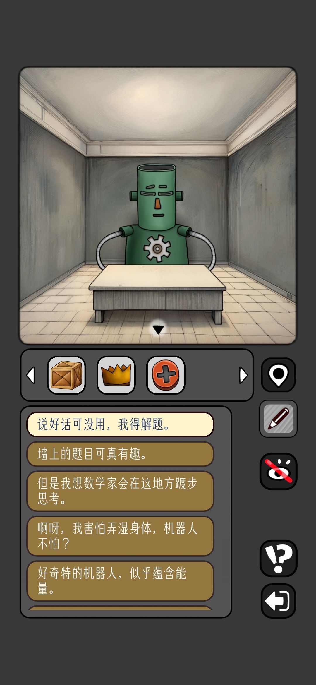 7.回到猫猫房间直走右拐进入泳池房间,将喇叭插入右侧开关,并按照灯泡人屋子墙壁上眼睛的方向答题,获得怪物头上红帽子,回到胖机器人房间将帽子给他获得铁球