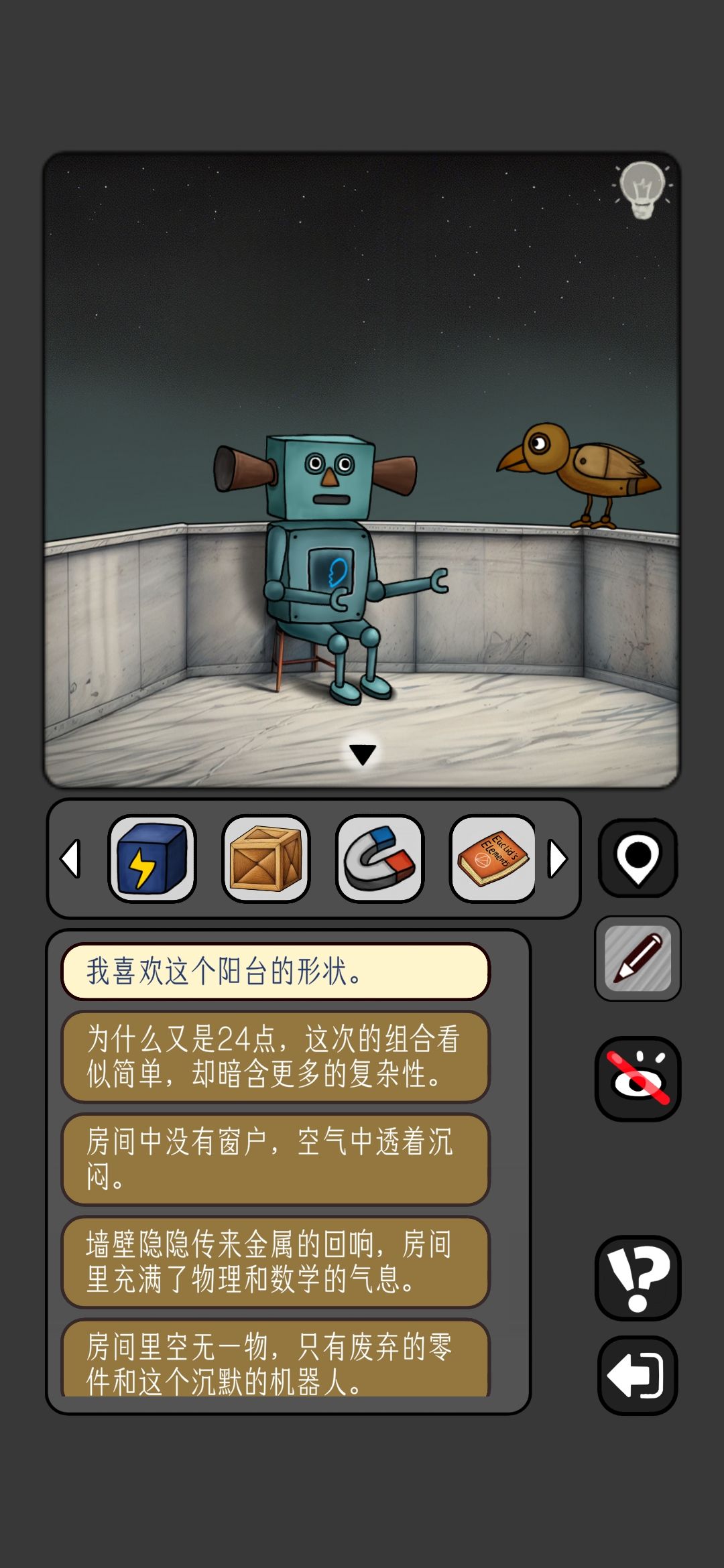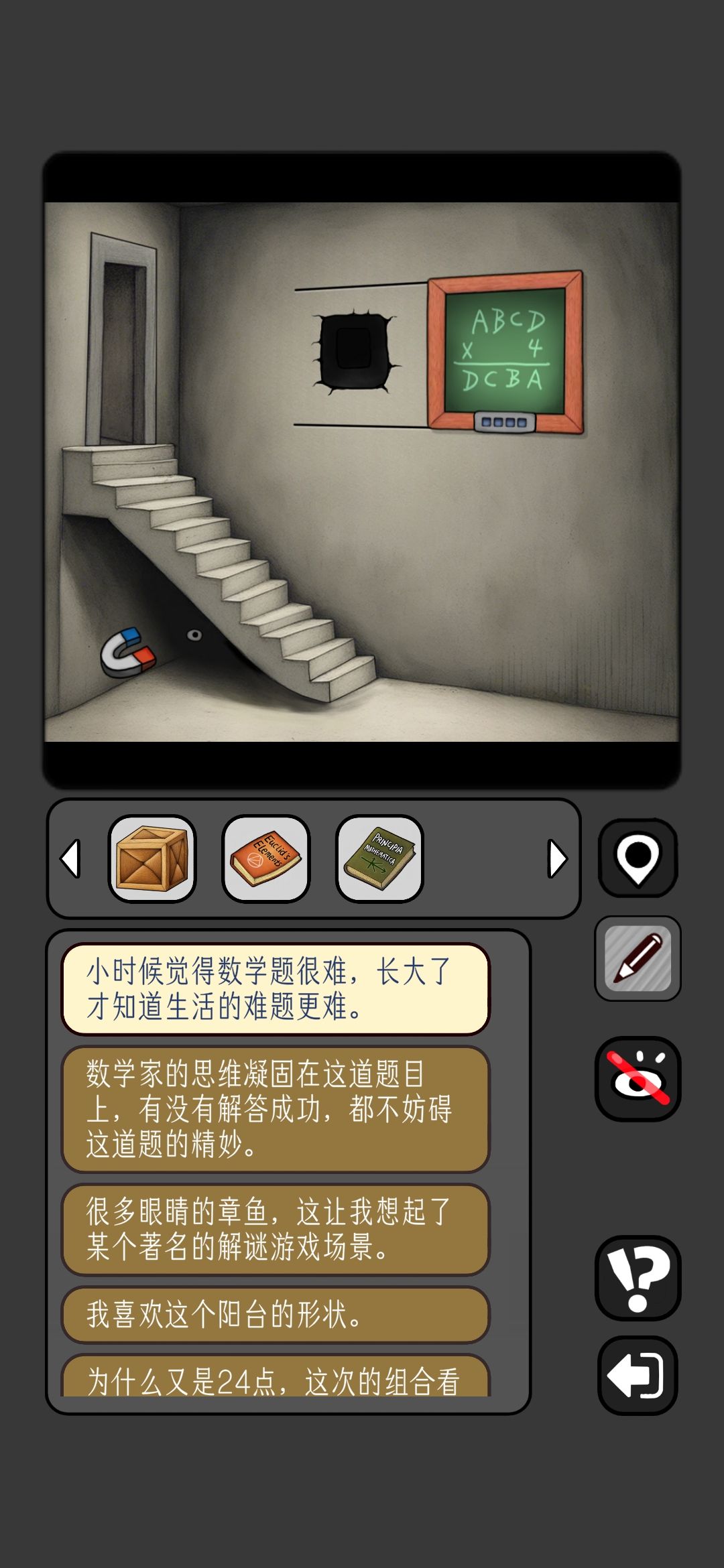 10.电池给灯泡人,墙上箭头每一个数列是一个数字,按照箭头方向画火柴数字得到5206,可以解开中轴第二个房间的谜题11.回到ABCD房间,用磁铁吸楼梯下的眼睛,获得一个齿轮