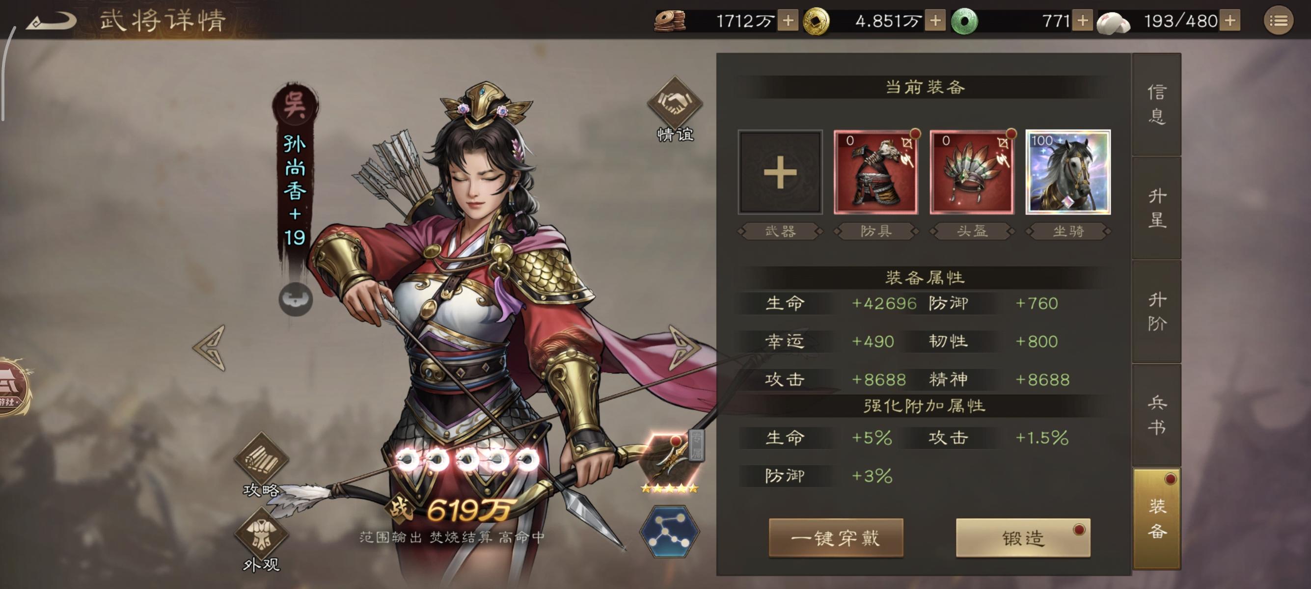 把其他主力的装备拿过来!孙策可以用吕布的装备,孙尚香的装备也没有,凑一个马…神兵就用别跟的5星神兵,这里我们拿了吕布和诸葛的