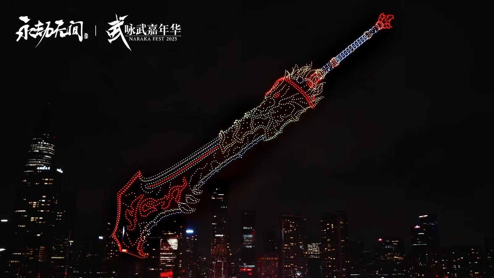 劫妹调来2500台无人机,在深圳湾夜空拼出一把300米长的狼主。