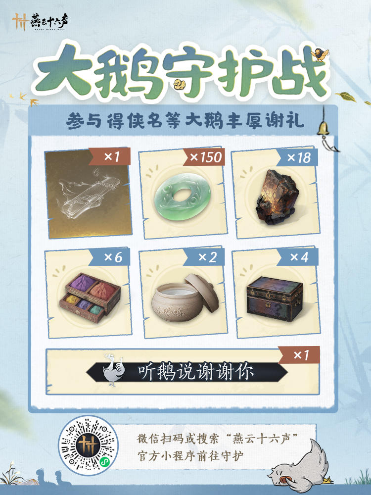 这一载江湖路中,游侠以刀剑侠心守护了诸多故人与新友。可最近听闻村霸大鹅遭遇麻烦,它们的田地被虫子包围破坏,急需游侠驰援!虽然这一年与它们相爱相杀,但在此欢庆之际,大鹅还得亲自守护。据说虫子数量众多,大鹅早已应接不暇,还望游侠呼朋唤友、集结更多同袍,方可助大鹅一臂之力!打开下方小橙序,便可开启“大鹅守护战”。