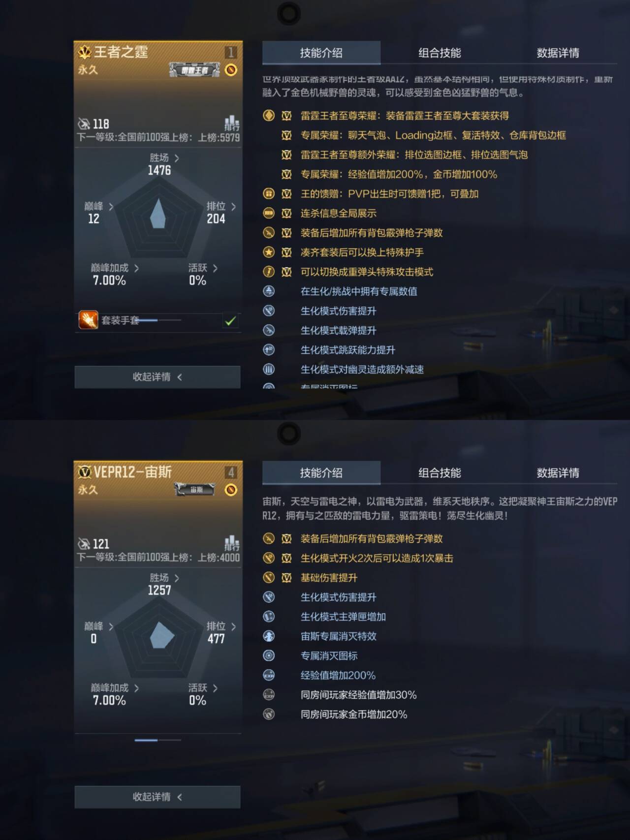 进入生化模式之后,两者性能各有优缺点。第一方面是射速,VEPR12-宙斯的射速高于王者之霆,它的射速为400发/分,而王者之霆的射速为272发\分。第二方面是续航,射速高带来的一个缺点就是子弹量的问题,同时装备王者之霆和VEPR12-宙斯进入生化模式,王者之霆的主弹匣为57/340发;而VEPR12-宙斯的主弹匣为40/198发。在续航上,王者之霆优于VEPR12-宙斯,子弹容量多了近160发。