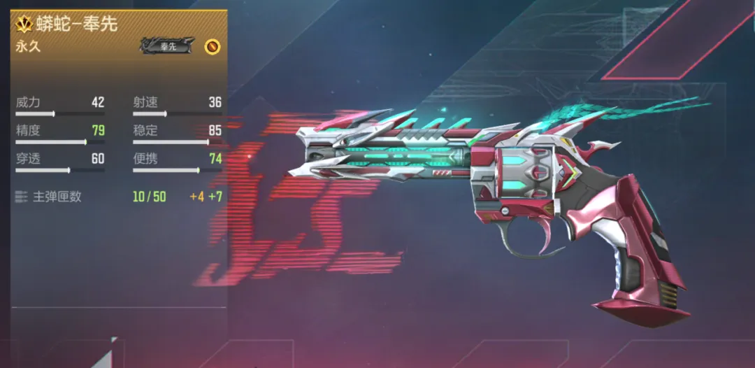 蟒蛇-奉先-无双的设计基本与主武器一致,枪械两侧的飘带和瞄准特效光环等特效集中到了检视动作之中。