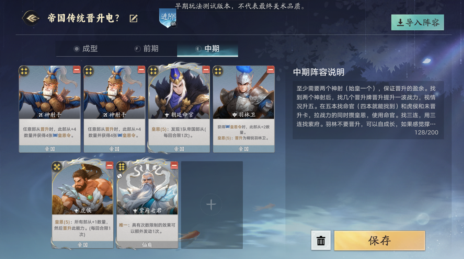 羽林军,未晋升时可以配合神射,在晋升时同步获得强化,作为前线的基石为神射提供较为安全的输出环境(仙庭瞬移的小人)