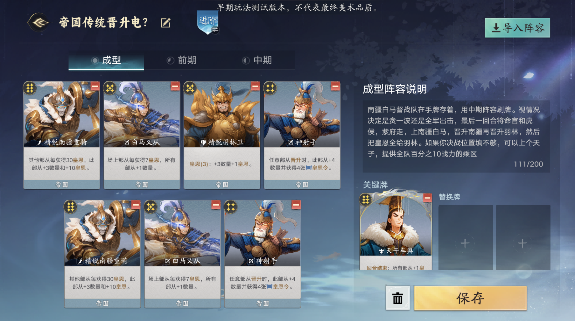 决战时刻,场上只允许存在神射,精锐羽林,精锐南疆,白马,天子,虎侯(天子和虎侯只能是场上格子填不满的时候要,不然就只有前四种)。将南疆白马都上场,先晋升南疆,再晋升羽林,最后全部喂给精锐羽林
