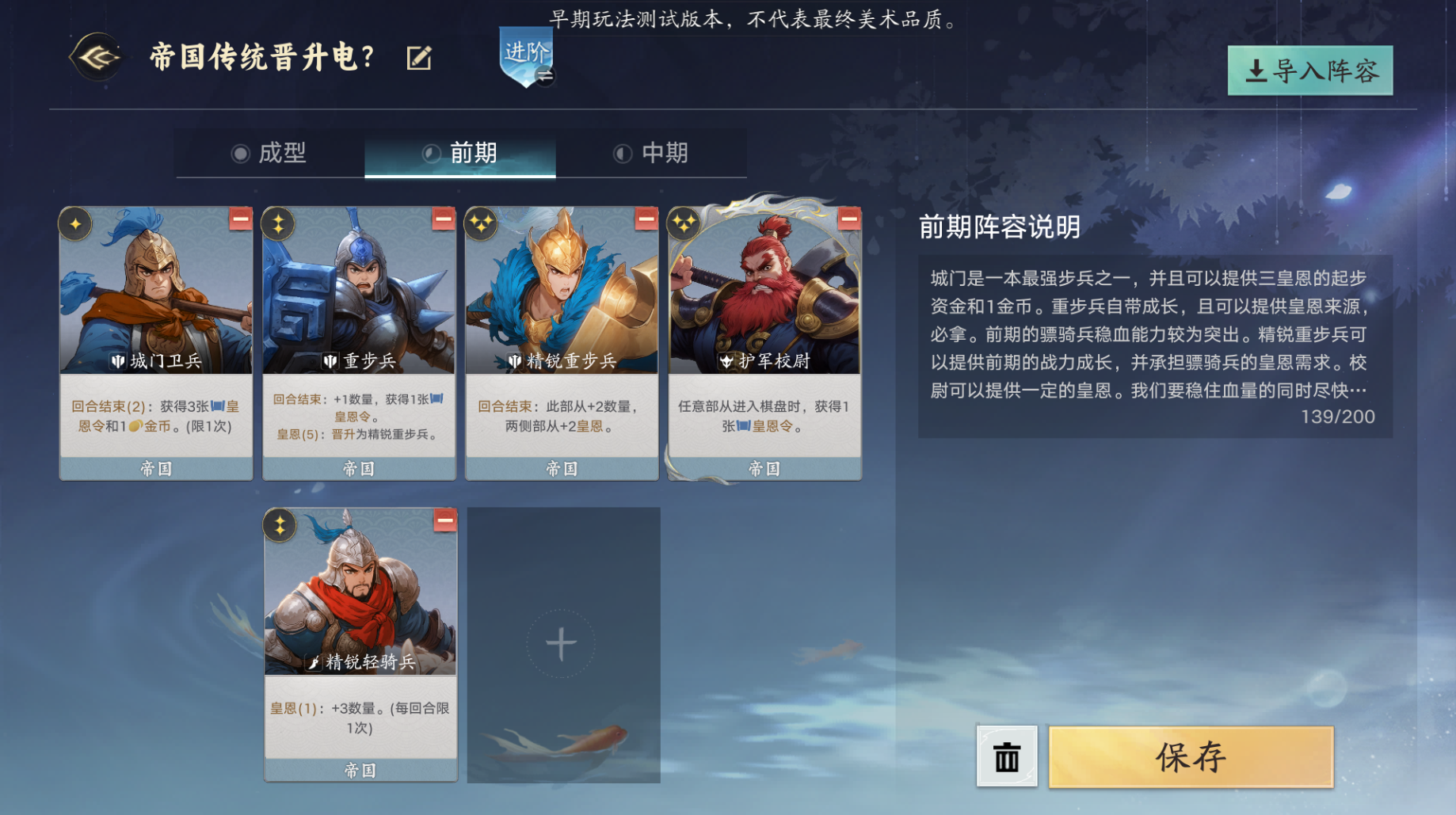 帝国的三连使用很重要,可以让你在三本对四,五本对六,并且帝国自带全游戏中唯一的无限卡池,可以很容易追出三连。比如有两个已经晋升了的军团,你可以第三个不晋升,在合适的本数晋升,对四,对五,对流。反之同理。