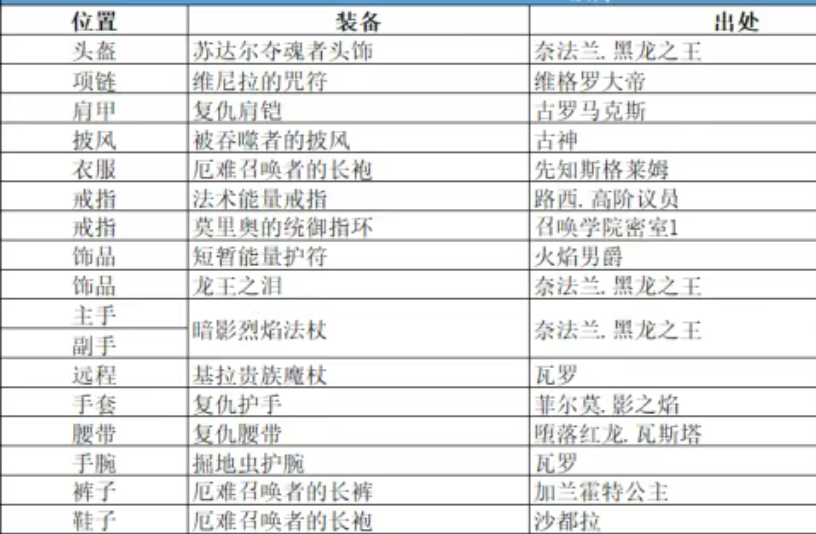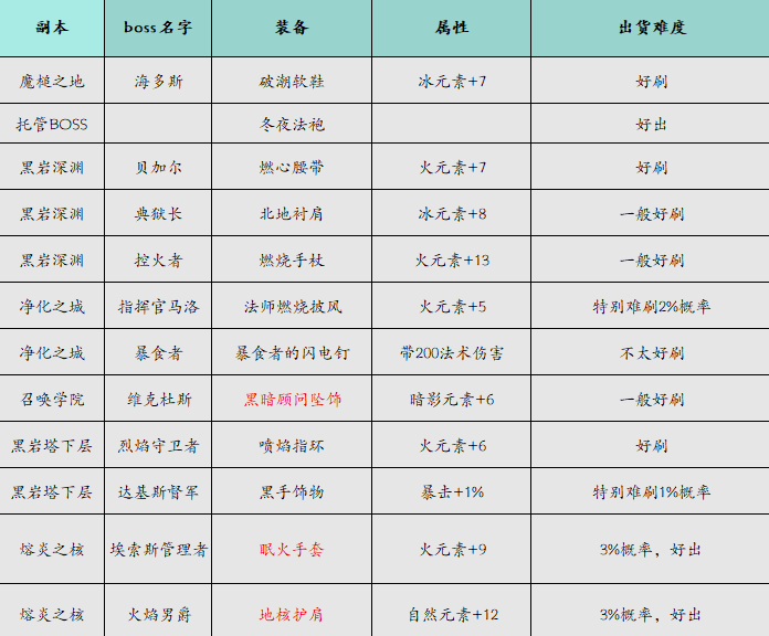 还是老样子。熔火之前按照以下表格收集元素装备。