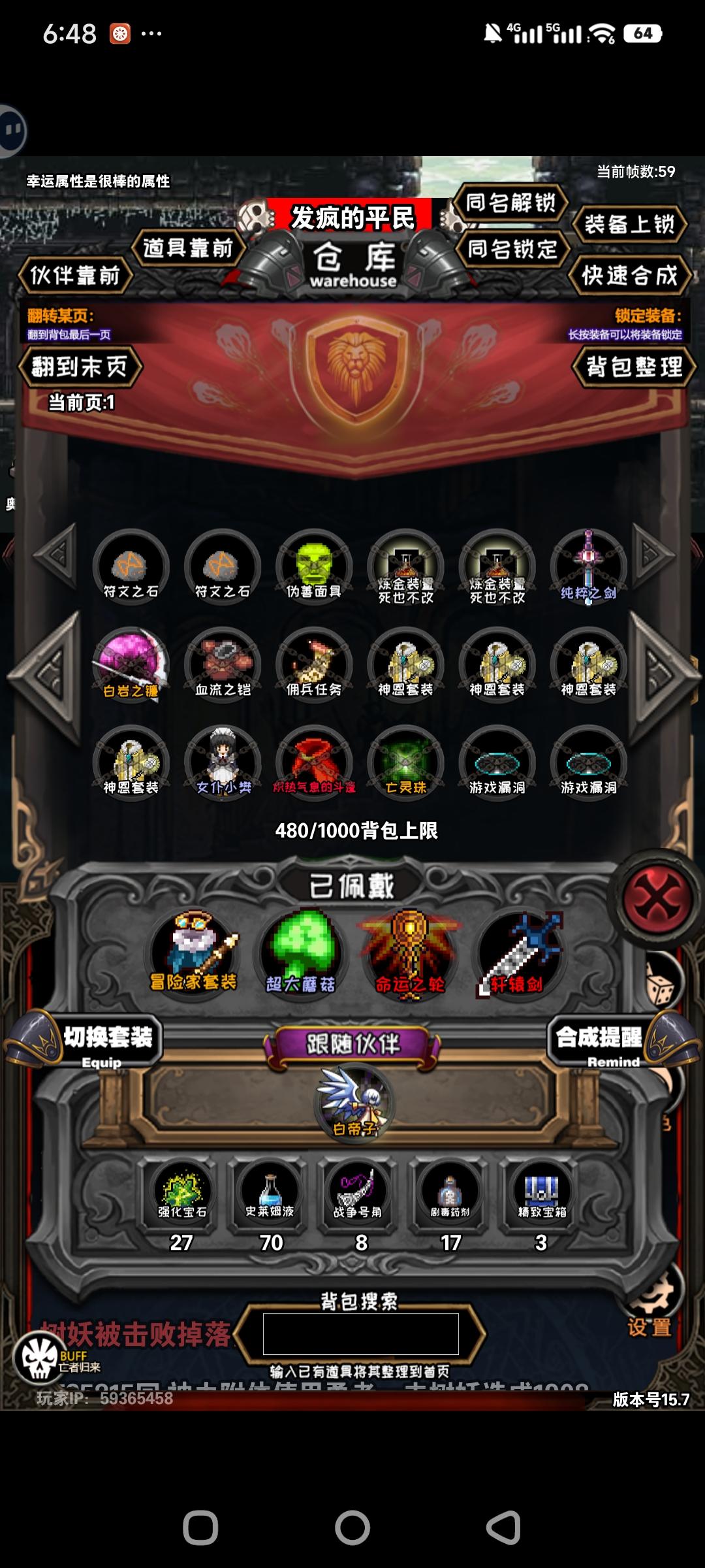 前期随便什么装备过度,注意一下[大蘑菇],可以一直用到结束,这个一定有的或早或晚,我来的比较晚2000到3000层之间出的,上一次用武器大师50层就来了(别问什么是上次,卖错东西加上刮痧直接弃了,悲)