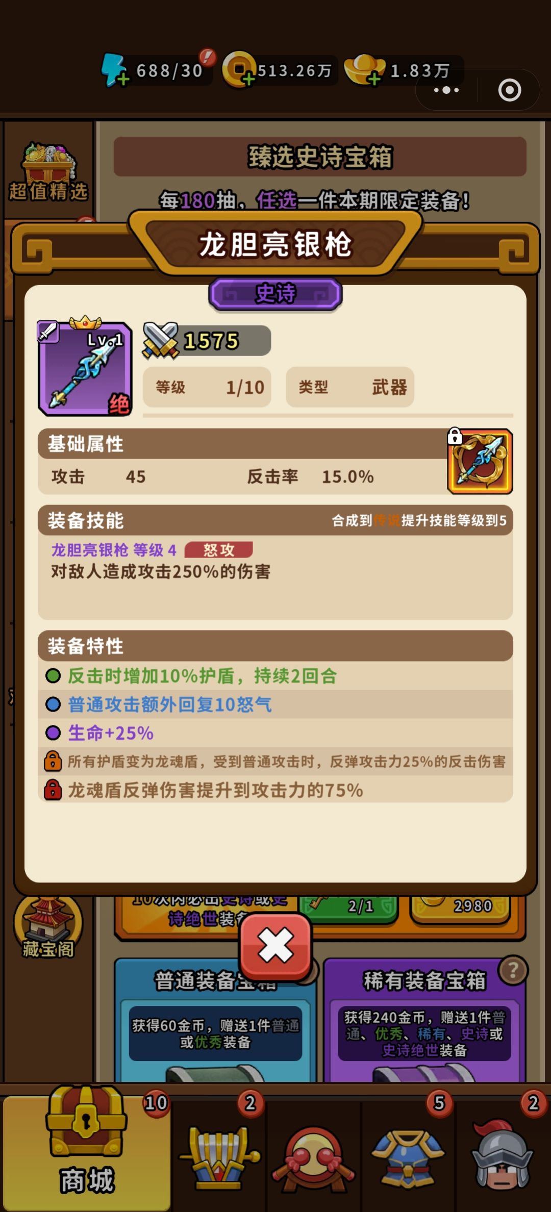 6:关刀带反击神器 如果不打彩色宝石是可以的 十星虎符带满级曹仁和进场刘备 可以每回合拥有40+30+8=78 减去黄色24 78-24=54反击率 理论是可以天龙配合暴击收割的,但是如果面对后续红色抗反武将就没必要了或者是打彩色坚韧不倒还是满星刑天。